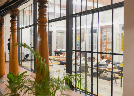 Our architect Laurent Fournier did an wonderfull creative work by using 50-60 years old chettinad wooden pillars from south of India and 100 years old wooden doors and wondows from Kolkata Jamindar house. A perfect combination of a recycled sustainable atelier in the service of our creative brand designers.