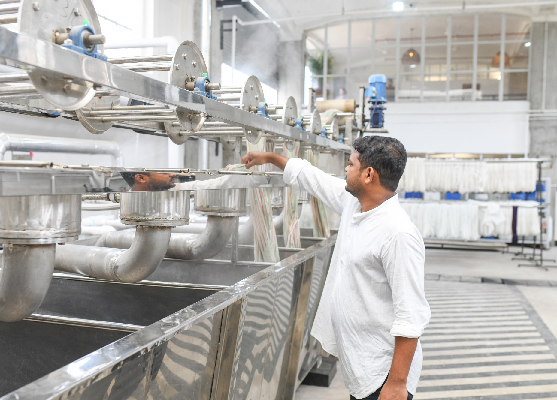 All dyeing is done at the workshop. We have 4 dyeing machines with a capacity of 300 kg / day, the equivalent of 3000 hand-woven fabrics. We practice yarn or fabric dyeing.